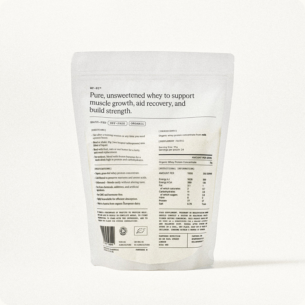 WP-01™ is made from 100% organic, grass-fed whey concentrate, cold-filtered to preserve its nutritional integrity. It contains no additives, flavours, sweeteners, or fillers - just clean, high-quality protein.